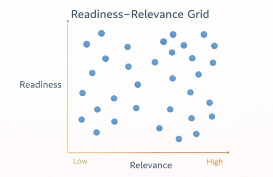 To capstone the work, we closed with what I call a relevance–readiness pulse check. I asked board members to look across the different prototypes they had just encountered and, rather than defaulting to what they liked or didn’t like—a move that can be difficult in groups where trust is still forming—to assess each one along two dimensions: relevance and readiness.
