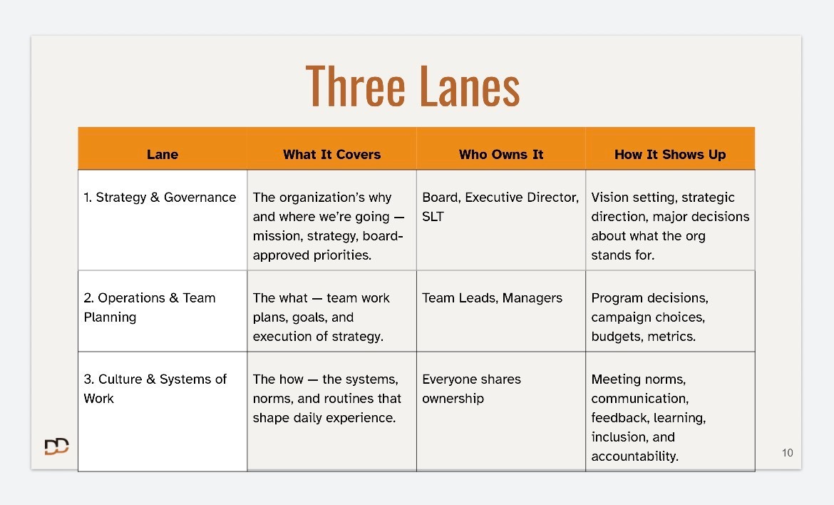 In my experience, the distinction helps people stop locating equity solely in interpersonal behavior and begin to see how structure, process, and norms carry power. In the room, it allowed us to be clear about where the work for the day would live. While inequity can surface across governance, operations, and culture, our collective authority sat at the level of everyday systems and practices—and that’s where we focused our design work.
