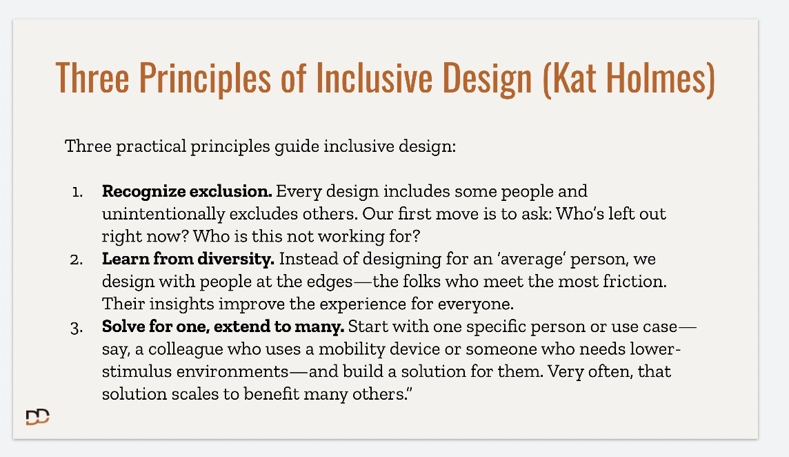 Only after that did we return to design for inclusion—a set of principles I had introduced in a previous session and wanted to bring back into active use. The idea was simple but demanding: when you design for the person most likely to be excluded, you don’t diminish the experience for others—you strengthen the system.