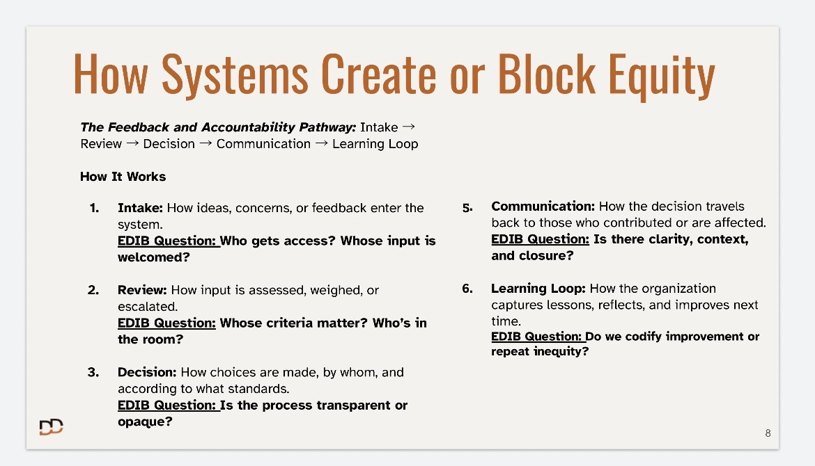 I walked them through a full cycle—intake, review, decision, communication, and learning—and showed how, at any point along that pathway, a breakdown could occur. Where loops fail to close. Where clarity dissolves. Where inequity gets produced not through intent, but through design.
