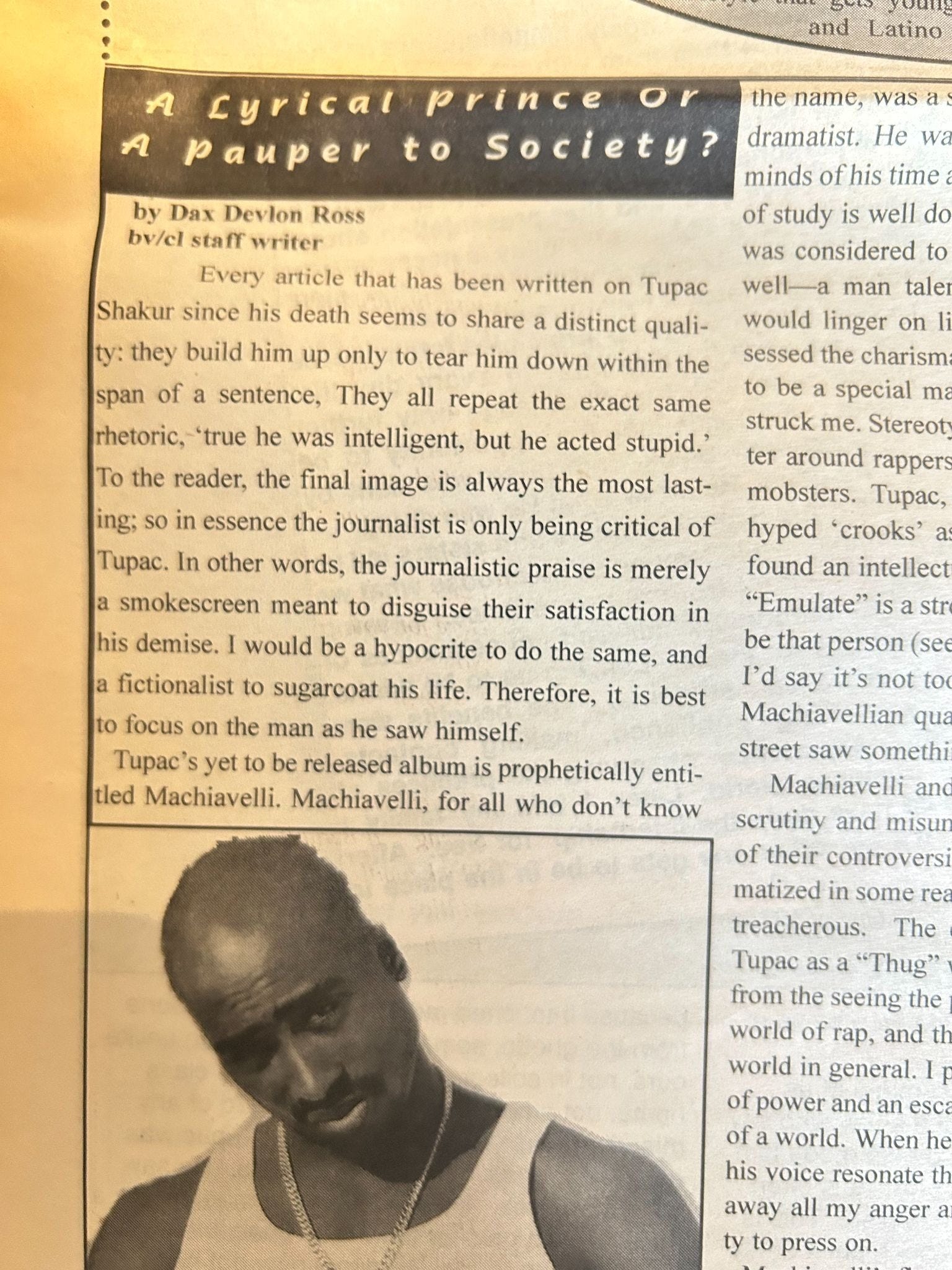 He came right over and sat down in the small room. I left him alone to read. When he emerged, he just looked at me and said that he loved it. Darryl took it to our friends Robyn and Butterfly — yes, that was her name, very nineties, very Gen X — who were the editors of the Black Voice/Carta Latina newspaper on campus.