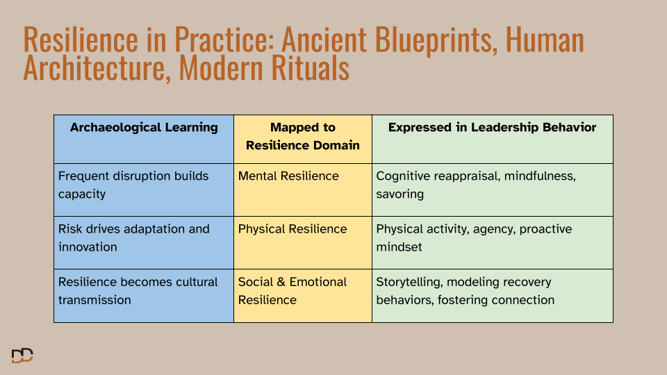 After introducing both tools, I zoomed back out with the group to show how they fit together. The organizational diagnostic gave them a way to see resilience at the systems level: how their culture, structures, and practices helped or hindered their ability to bounce forward. The CORE diagnostic, by contrast, brought the lens down to the individual leader: how habits, mindsets, and daily behaviors shaped the very culture they were trying to build. Taken together, the two tools reveal resilience as a system that moves between levels. The ancient lessons provide the blueprint. The CORE framework offers the architecture. The behaviors become the rituals that bring resilience to life.